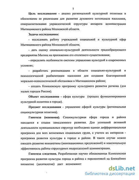 В основу данной работы положено исследование социально-культурной сферы Мытищинского района Московской области, что дает возможность взглянуть на проблемы региональной культурной политики изнутри, оценить сложившуюся ситуацию и выработать рекомендации для исключения недостатков в работе органов управления. Исследований в этом направлении в районе не проводилось, что определяет актуальность диссертации.