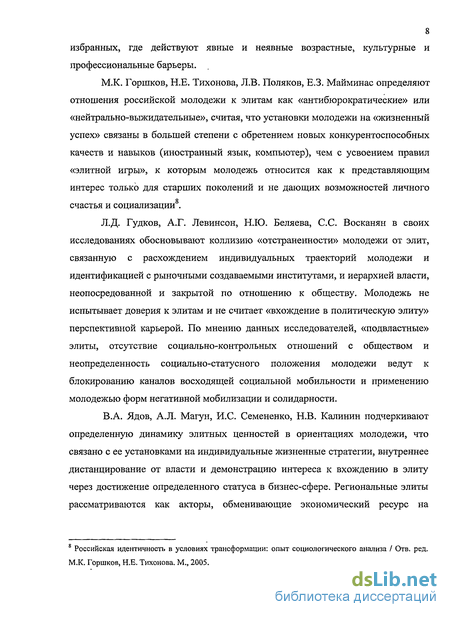 М.К. Горшков, Н.Е. Тихонова, Л.В. Поляков, Е.З. Майминас определяют отношения российской молодежи к элитам как «антибюрократические» или «нейтрально-выжидательные», считая, что установки молодежи на «жизненный успех» связаны в большей степени с обретением новых конкурентоспособных качеств и навыков (иностранный язык, компьютер), чем с усвоением правил «элитной игры», к которым молодежь относится как к представляющим интерес только для старших поколений и не дающих возможностей личного счастья и социализации8.