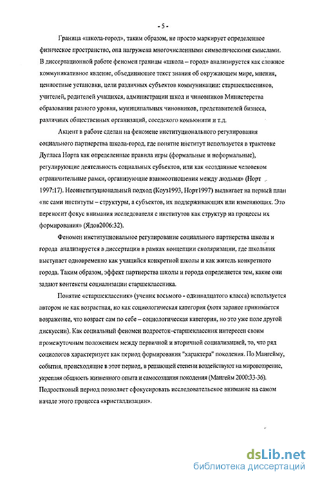 В диссертации феномен институционального регулирования социального партнерства школы и города анализируется в рамках исследовательской традиции, возникшей во Франции в 80-е годы ХХ-го века и интерпретирующей процессы «сколяризации» как все социальные процессы, разворачивающиеся вокруг школы.