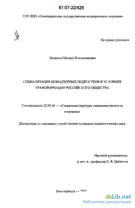 дано обоснование воспитанию как определяющему началу социализации безнадзорных подростков, раскрыта специфика гражданской и политической социализации, а также показана роль семьи и образования в социализаци-онном процессе. При этом выявлены особенности личностно ориентированной модели образования и воспитания подростков (приоритетная роль их саморазвития, самоорганизации, личностного самоопределения, усиления коммерциализации в среде образования и воспитания и др.);
