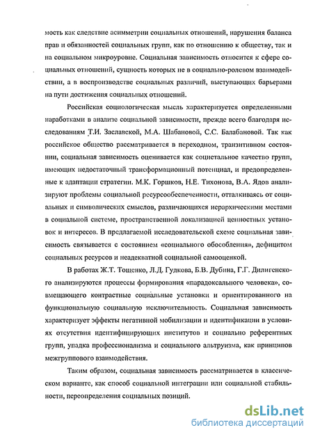 В работах Ж.Т. Тощенко, Л.Д. Гудкова, Б.В. Дубина, Г.Г. Дилигенско-го анализируются процессы формирования «парадоксального человека», совмещающего контрастные социальные установки и ориентированного на функциональную социальную исключительность. Социальная зависимость характеризует эффекты негативной мобилизации и идентификации в условиях отсутствия идентифицирующих институтов и социально референтных групп, упадка профессионализма и социального альтруизма, как принципов межгруппового взаимодействия.