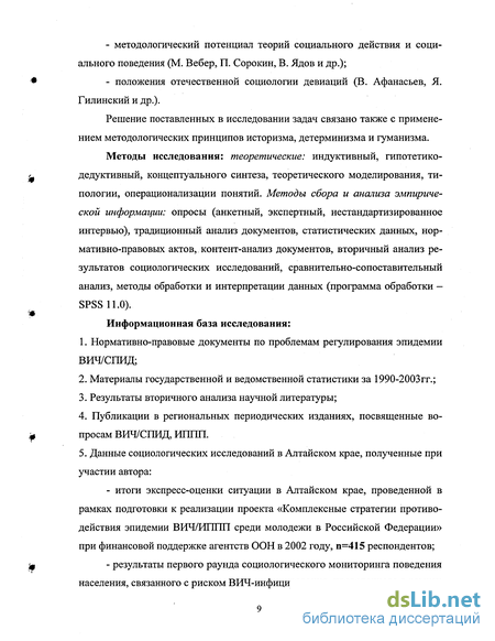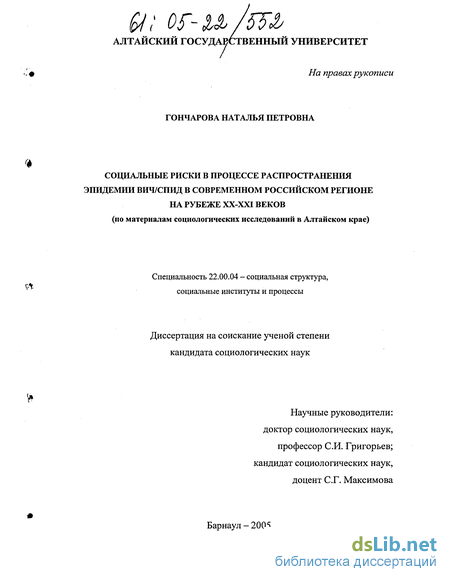 Целью диссертационного исследования является изучение специфики и закономерностей социальных рисков в процессе распространения эпидемии ВИЧ/СПИД в современном российском регионе на рубеже XX-XXI веков и разработка на этой основе рекомендаций по совершенствованию профилактических программ в области противодействия ВИЧ/СПИДу (на примере Алтайского края).