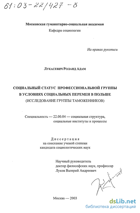 Что касается изучения социологических аспектов таможенной службы, то здесь имеется немало исследований современных российских авторов, и среди них А. П. Балана, П. К. Гончарова, В. Б. Кухаренко, Л. А. Лозбенко, Е. Н. Махова. В. А. Адигамов специально исследовал социальные процессы в таможенной службе в период вступления России во Всемирную торговую организацию. Однако в основном исследуются вопросы таможенной службы как социального института, анализ статусных характеристик таможенников представлен лишь фрагментарно. В польской социологической литературе проблемы изменения социального статуса профессиональной группы таможенников за последние двенадцать лет до момента вступления Польши в Европейский Союз (т. е. до появления новой ситуации в Европе) в целом еще не исследовалась. Практически нет опубликованных исследований, касающихся не только данной профессиональной категории, но вообще тех социальных групп, которые ощутили на себе постепенное падение престижа своей профессии и социального статуса, почувствовали ограничение доступа к материальным благам и столкнулись с необходимостью полной реорганизации своей профессиональной деятельности и, возможно, смены ее целей и задач.