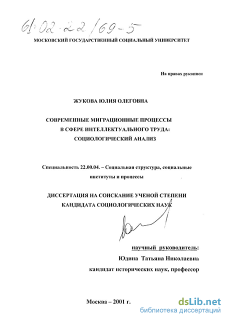 Жукова Юлия Олеговна. Современные миграционные процессы в сфере интеллектуального труда: социологический анализ : диссертация ... кандидата социологических наук : 22.00.04.- Москва, 2001.- 177 с.: ил. РГБ ОД, 61 02-22/69-5