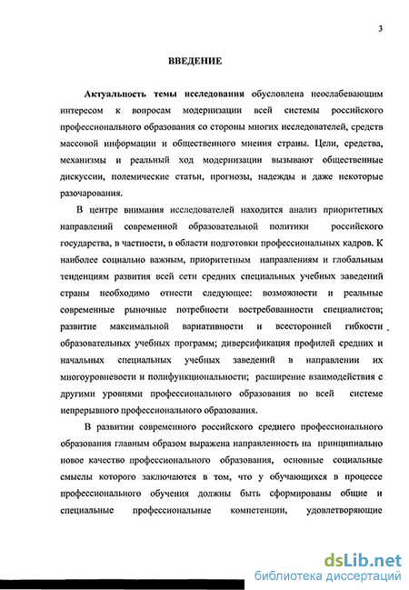 Актуальность темы исследования обусловлена неослабевающим интересом к вопросам модернизации всей системы российского профессионального образования со стороны многих исследователей, средств массовой информации и общественного мнения страны. Цели, средства, механизмы и реальный ход модернизации вызывают общественные дискуссии, полемические статьи, прогнозы, надежды и даже некоторые разочарования.