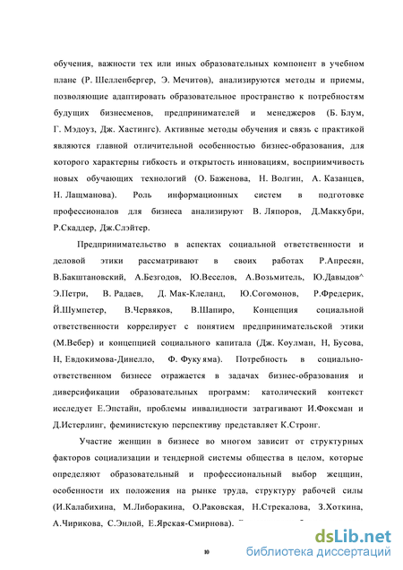 Таким образом, современный этап исследований бизнес-образования характеризуется, с одной стороны, определенными достижениями в междисциплинарном ключе, с другой стороны, недостаточной степенью анализа ряда содержательных вопросов, принципиальных для бизнес- образования как специфического социального института в системе образования. Несмотря на растуш;ий объем литературы по проблемам образования, отсутствует фундаментальное социологическое исследование становления и трансформации системы образования в сфере реального бизнеса. Большинство современных отечественных и зарубежных исследований организации бизнес-образования построены по принципу дескриптивных изложений на основе обобщения эмпирического материала, при этом практически отсутствуют концептуальные разработки важнейших характеристик бизнес-образования, социокультурных аспектов становления и взаимодействия отечественных институтов и технологий бизнес- образования и социального менеджмента.