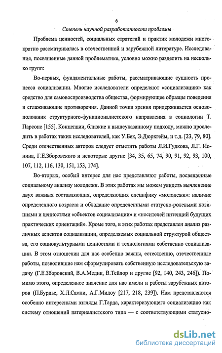 Во-первых, фундаментальные работы, рассматривающие сущность процесса социализации. Многие исследователи определяют «социализацию» как средство для самовоспроизводства общества, формирующее образцы поведения и сглаживающие противоречия. Данной точки зрения придерживается основоположник структурного-функционалистского направления в социологии Т. Парсонс [155]. Концепции, близкие к вышеуказанному подходу, можно проследить в работах таких исследователей, как У.Бек, Э.Дюркгейм, и т.д. [23,79, 80]. Среди отечественных авторов следует отметить работы Л.И.Гудкова, Л.Г. Ио-нина, Г.Е.Зборовского и некоторые другие [34, 35, 65, 74, 90, 91, 92, 93, 100, 107,112,116,130,151,153,174].