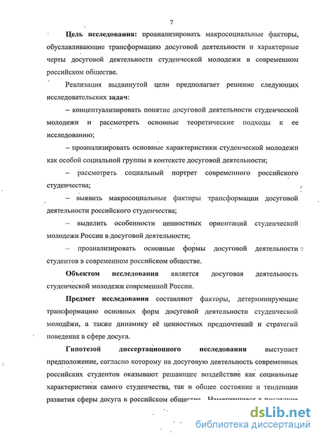 предположение, согласно которому на досуговую деятельность современных российских студентов оказывают решающее воздействие как социальные характеристики самого студенчества, так и общее состояние и тенденции развития сферы досуга в российском обществе. Наметившиеся в последние