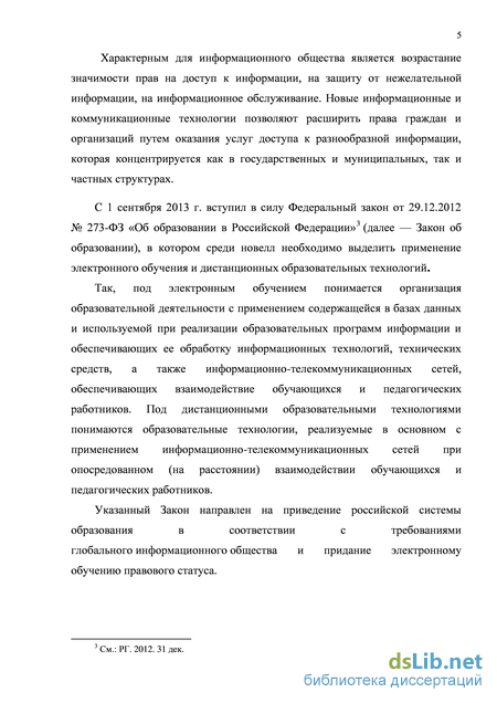 С 1 сентября 2013 г. вступил в силу Федеральный закон от 29.12.2012 № 273-ФЗ «Об образовании в Российской Федерации» (далее — Закон об образовании), в котором среди новелл необходимо выделить применение электронного обучения и дистанционных образовательных технологий. Указанный Закон направлен на приведение российской системы образования в соответствии с требованиями глобального информационного общества и придание электронному обучению правового статуса.