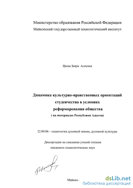 Цеева Заира Алиевна. Динамика культурно-нравственных ориентаций студенчества в условиях реформирования общества : На материалах Республики Адыгея : диссертация ... кандидата социологических наук : 22.00.06.- Майкоп, 2002.- 143 с.: ил. РГБ ОД, 61 03-22/174-0