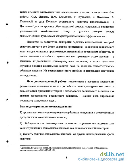 Цель диссертационной работы заключается в изучении проявления феномена социального капитала в российском социокультурном контексте и возможностей применения теории и методологии социального капитала для анализа современного российского общества. Данная цель определила постановку следующих задач.