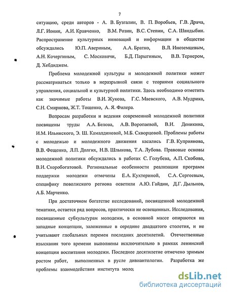 Степень научной разработанности проблемы. В сфере внимания исследователей, занимавшихся вопросами молодежи и молодежной политики, находились социальные, социально-психологические, политические, идеологические, юридические, культурологические и другие аспекты, которые анализировались с различных теоретических позиций.