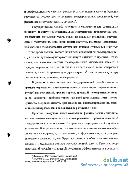 Изучение престижа именно государственной службы сделало необходимым анализ многочисленных работ по проблемам государственной службы в Российской Федерации разного уровня глубины и направленности. Перечисление их заняло бы несколько страниц. Признавая достоинства большинства из них, отметим теоретико-методологическую значимость для диссертационного исследования работ Г.В. Атаманчука, В.Э. Бойкова, Г.П. Зинченко, Т.П. Коржихиной, В.П. Мельникова, В.С Нечипоренко, Р.Г. Пихоя, А.В. Оболонского, Е.В. Охотского, Н.В. Романовского, А.С. Сенина, Ж.Т. Тощенко, А.И. Турчинова.
