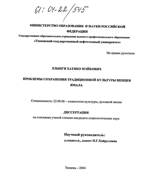 - Социокультурная ситуация в жизнедеятельности ненцев Ямало-Ненецкого автономного округа