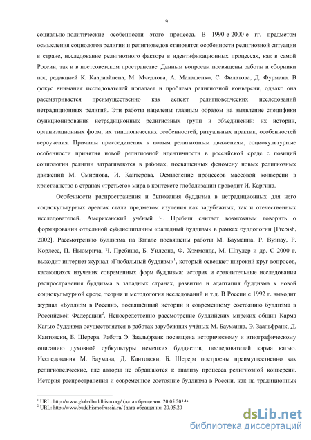 новой социокультурной среде, теория и методология исследований и т.д. В России с 1992 г. выходит журнал «Буддизм в России», посвященный истории и современному состоянию буддизма в Российской Федерации1. Непосредственно рассмотрение буддийских мирских общин карма кагью буддизма осуществляется в работах зарубежных учёных М. Бауманна, Э. Заальфранк, Д. Кантовски, Б. Шерера. Работа Э. Заальфранк посвящена историческому и этнографическому описанию духовной субкультуры немецких буддистов, последователей Карма Кагью. Исследования М. Баумана, Д. Кантовски, Б. Шерера построены преимущественно как религиоведческие, где авторы не обращаются к анализу процесса религиозной конверсии. История распространения и современное состояние буддизма в России, как на традиционных территориях его бытования, так и в нетрадиционных для него ареалах, затрагиваются в работах Н. Жуковской, Е. Островской, В. Пореша, Е. Сафроновой, А. Терентьева, М. Уланова. А. Агаджнян, Д. Аюшеева и М. Уланов рассматривают феномен «глобализированного» или «глобального» буддизма, роль новых и традиционных буддийских сообществ в пространстве глобального буддизма, социокультурные особенности адаптации вероучения и практик к потребностям современного западного человека, социокультурные предпосылки распространения тибетского буддизма вне традиционных ареалов его бытования, проводят социально-философский анализ буддийской доктрины. А. Алексеев-Апраксин осуществляет культурологический анализ деятельности различных буддийских сообществ, в том числе общины Карма Кагью, в социокультурной среде Санкт-Петербурга. Е. Балагушкин и Л. Коротецкая в диссертационных исследованиях проводят религиоведческий и социально-философский анализ доктрины мирских буддийских сообществ Карма Кагью, предлагаемой Оле Нидалом. Социально-антропологические исследования петербургской общины карма кагью были осуществлены Е. Островской и Т. Быченко. В кандидатской диссертации Е. Островская охарактеризовала принципы организации и типологические особенности общины Карма Кагью, ритуальные практики адептов общины,