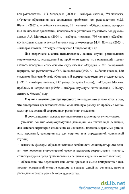 Таким образом, отдельные аспекты проблемы социокультурных девиаций студентов в современной России достаточно глубоко разработаны в научной литературе, однако работы, рассматривающие данное явление в комплексе, отражающие его глобальные, конкретно-исторические и прикладные аспекты на современном этапе, отсутствуют.