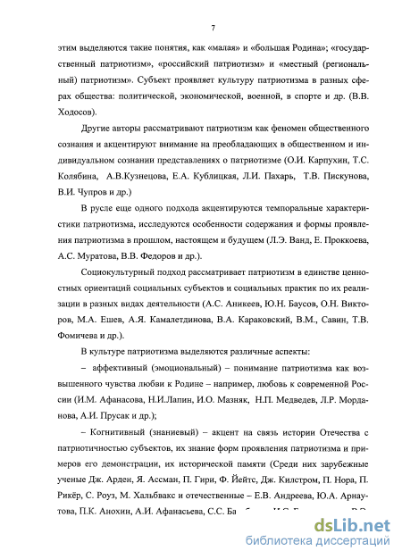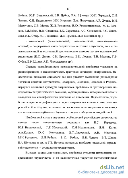 Ориентация на анализ особенностей культуры патриотизма российского студенчества определила обращение к работам об этой социальной группе (Е.С.Баразгова, Г.Е. Зборовский, Ю.А. Зубок, С.Н. Иконникова, Л.Н. Коган, А.А. Козлов, Ю.С. Колесников, В.Т. Лисовский, А.В. Меренков, Т.Э. Петрова, Л.Я. Рубина, Б.С. Рубин, В.И. Чупров, В.Т. Шапко, Е.А. Шуклина и др.).
