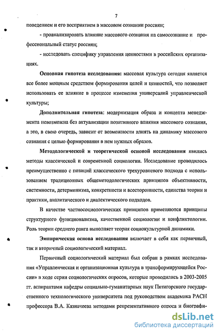 Основная гипотеза исследования: массовая культура сегодня является все более мощным средством формирования целей и ценностей, что позволяет использовать ее влияние в процессе изменения универсалий управленческой культуры;