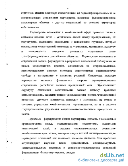 Исследование бизнес-партнерства как формирующегося института управления проводится автором в неразрывной связи с анализом институциональной и социокультурной структуры трансформирующегося российского общества, опираясь на работы Э. Андреева, А. Ахиезера, А-Бузгалина, А. Вишневского, Ю. Волкова, 3. Голенковой, Л. Гудкова, В. Добренькова; Г. Дилигенского, Т. Заславской, А, Зудина, В. Ильина, В: Каганского, С. Кирдиной, А, Кравченко, ТЇ Малевой, А. Маршака, Г, Осипова, А. Панарина, В.Стедина, Р. Трипольского, Ж. Тощенко, П. Щсдровицкого, В. Федотовой, М.А, Шабановой, В. Ядова, О. Яницкого и многих других.