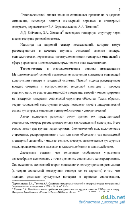 Несмотря па широкий спектр исследований, которые могут рассматриваться в качестве научных оснований анализа тендера, социологическая перспектива институционализации тендерных отношений в сфере управления и менеджмента, представлена пока недостаточно-Теоретические и методологические основы исследования Методологической основой исследования выступили концепции социальной конструкции тендера и тендерной системы. Первый подход рассматривает процесс создания и воспроизводство тендерной культуры в процессе социализации, то есть ее динамическое измерение; второй - концентрируется на тендерном измерении социальной структуры общества. Таким образом, теория социальной конструкции тендера позволяет изучать диахронический аспект культуры, а концепция тендерной системы - синхронический.