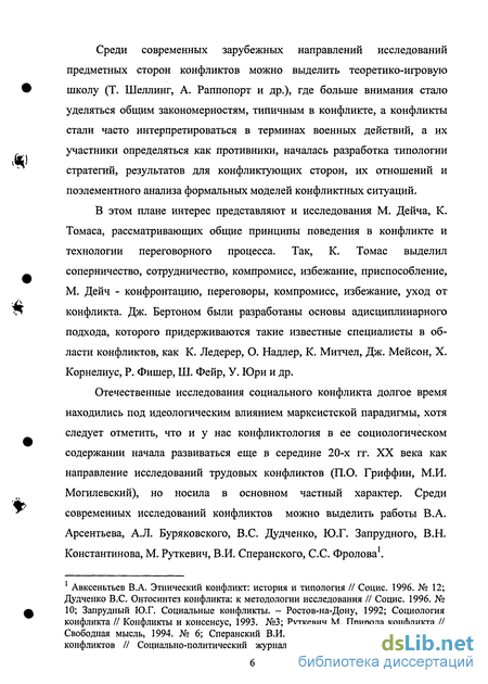 1 Авксеньтьев В.А. Этнический конфликт: история и типология // Социс. 1996. № 12; Дудченко B.C. Онтосинтез конфликта: к методологии исследования // Социс. 1996. № 10; Запрудный Ю.Г. Социальные конфликты. - Ростов-на-Дону, 1992; Социология конфликта // Конфликты и консенсус, 1993. №3; Руткевич М. Природа конфликта // Свободная мысль, 1994. № 6; Сперанский В.И. Конкретные факторы и причины конфликтов // Социально-политический журнал, 1996. № 3; Сперанский В.И.