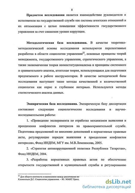 8 Предметом исследования является взаимодействие руководителя и исполнителя на государственной службе как системы агентских отношений и их оптимизация с целью повышения эффективности государственного управления за счет снижения уровня коррупции.