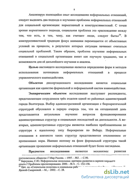 Объектом диссертационного исследования является социальная организация как единство формальной и неформальной систем взаимодействия.