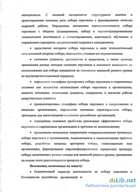 • проанализирована специфика отбора, персонала в американских и, японских организациях, определены основные характеристики отбора, пригодные для заимствования в условиях российских организаций;