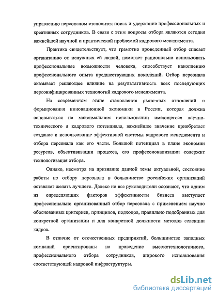 В отличие от отечественных предприятий, большинство западных компаний ориентированы на проведение высокотехнологичного, профессионального отбора сотрудников, широкого использования соответствующей кадровой инфраструктуры. Таким образом, актуальность темы исследования обусловлена, во-первых, потребностью социологического анализа отбора персонала в новых условиях неоклассического менеджмента и возникновения интерсубъектных отношений в организациях; во-вторых, необходимостью систематизации зарубежного и отечественного подходов к отбору персонала как технологии кадрового менеджмента; в-третьих, необходимостью определения основных направлений для совершенствования технологий отбора в организациях современной России.