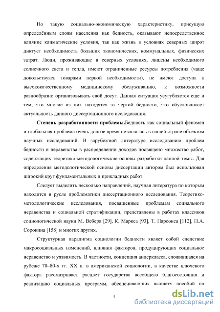 Определяя общее и различное в понятиях бедность и малообеспеченность, диссертант еще раз подчеркивает, что бедность является крайней степенью нужды, порог которой характеризует нищета (которая часто связана с девиантными формами поведения: алкоголизмом, наркоманией, бродяжничеством, проституцией). Бедность характеризуется невозможностью человека или семьи удовлетворять основные физические или социальные потребности, в то время как малообеспеченность характеризует ситуацию недостатка материальных ресурсов, приводящую к той же невозможности удовлетворять потребности в большей степени социального порядка.