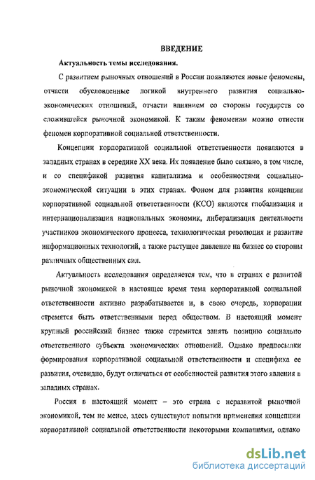 Актуальность исследования определяется тем, что в странах с развитой рыночной экономикой в настоящее время тема корпоративной социальной ответственности активно разрабатывается и, в свою очередь, корпорации стремятся быть ответственными перед обществом. В настоящий момент крупный российский бизнес также стремится запять позицию социально ответственного субъекта экономических отношений. Однако предпосылки формирования корпоративной социальной ответственности и специфика ее развития, очевидно, будут отличаться от особенностей развития этого явления в западных странах.