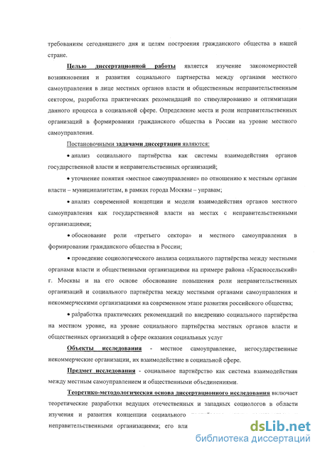 Постановочными задачами диссертации являются: анализ социального партнёрства как системы взаимодействия органов государственной власти и неправительственных организаций; уточнение понятия «местное самоуправление» по отношению к местным органам власти - муниципалитетам, в рамках города Москвы - управам; анализ современной концепции и модели взаимодействия органов местного самоуправления как государственной власти на местах с неправительственными организациями; обоснование роли «третьего сектора» и местного самоуправления в формировании гражданского общества в России; проведение социологического анализа социального партнёрства между местными органами власти и общественными организациями на примере района «Красносельский» г. Москвы и на его основе обоснование повышения роли неправительственных организаций и социального партнёрства между местными органами самоуправления и некоммерческими организациями на современном этапе развития российского общества; разработка практических рекомендаций по внедрению социального партнёрства на местном уровне, на уровне социального партнёрства местных органов власти и общественных организаций в сфере оказания социальных услуг
