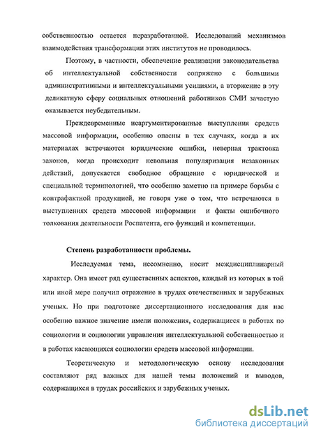 Исследуемая тема, несомненно, носит междисциплинарный характер. Она имеет ряд существенных аспектов, каждый из которых в той или иной мере получил отражение в трудах отечественных и зарубежных ученых. Но при подготовке диссертационного исследования для нас особенно важное значение имели положения, содержащиеся в работах по социологии и социологии управления интеллектуальной собственностью и в работах касающихся социологии средств массовой информации.
