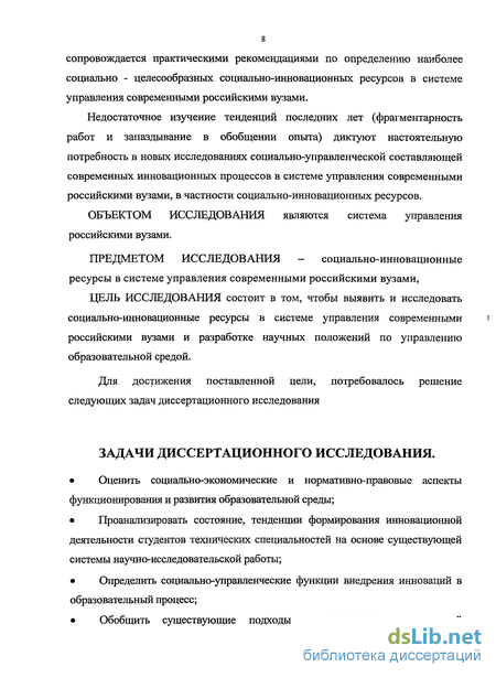 ЦЕЛЬ ИССЛЕДОВАНИЯ состоит в том, чтобы выявить и исследовать социально-инновационные ресурсы в системе управления современными российскими вузами и разработке научных положений по управлению образовательной средой.