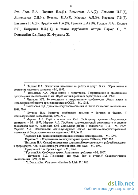 Это Ядов В.А., Таршис Е.А.(1), Возмитель А.А.(2), Левыкин И.Т.(З), Ямпольская С.Д.(4), Бутенко И.А.(5), Маршак А.Л.(6), Карадже Т.В.(7), Еньшина Н.А.(8), Пруденский Г.А.(9), Грушин Б.А.(Ю), Гордон Л.А., Клопов Э.В., Патрушев В.Д.(П), а также зарубежные авторы Паркер С, Y. Dumazedier(12), Делор Ж., Фурастье Ж. 1 Таршис Е.А. Ориентация населения на работу и досуг. В кн.: Образ жизни и состояние массового сознания. -М., 1992. 2 Возмитель А.А. Образ жизни и перестройка. Теоретические и практические предпосылки исследования. В кн.: Образ жизни в условиях перестройки. - М., 1992. 3 Левыкин И.Т. Региональные и национальные особенности образа жизни и использование бюджета времени населения СССР. -М., 1988. 4 Ямпольская С.Д. Динамика досугового общения. // Социологические исследования, 1989, №6. 5 Бутенко И.А. Качество свободного времени у богатых и бедных. // Социологические исследования, 1998, № 7. 6 Маршак А.Л. Клуб и посетитель. Спб. Свободному времени общественное внимание. - М., 1977; Маршак А.Л. Проблема социокультурной деятельности в системе социальной защиты населения. Спб. Социальная работа и социология. Ч. 2. - М., 1999; Маршак А.Л. Особенности социокультурных связей социально-дезориентированной молодежи. // Социологические исследования, 1998, № 12. 7'Карадже Т.В. Тенденции мирового цивилизационного процесса. - М., 1996. Карадже Т.В. Современные социокультурные ареалы.// Школа, 1997, №2. 8 Еньшина Н. А. Специфика развития социальной ответственности рабочей молодежи в сфере досуга. Авт. на соискание уч. степени канд. соц. наук. - М., 1999. 9 Пруденский Г. А. Время и труд. - М., 1965. 10 Грушин Б.А. Свободное время. Актуальные проблемы. - М., 1967. 11 Патрушев В.Д. Пенсионер: его труд, быт и отдых.// Социологические исследования, 1998, № 10. 12 Y. Dumazedier. Vers une civilisation du loisir. P. 1962.
