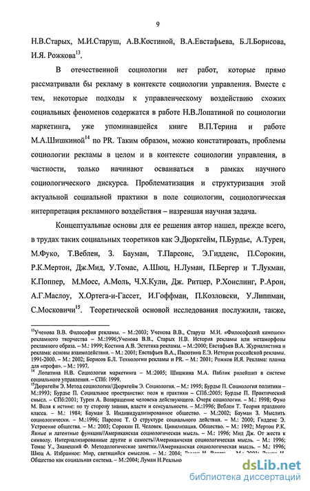 Для зарубежных и отечественных специалистов наиболее типичен анализ рекламы в связи с социологией коммуникационных процессов. Эту традицию заложил Г.М.Маклюэн, продолжили Ф. Уэбстер, Д.МакКуэйл, Дж. Брайант, Р.Харрис, Дж.Мюрдок и Н.Джэнис6 и др. Из российских ученых рекламу в контексте социологии коммуникаций рассматривали В.П.Терин, М.М.Назаров, СВ. Бориснев, Л.М.Землянова, Е.Я.Дугин, Ф.И. Шарков7 и др.