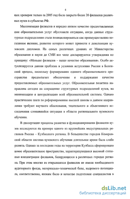 В диссертации процессы развития и функционирования филиалов вузов исследуются на примере одного из крупнейших индустриальных регионов России - Кузбасского региона. В большинстве городов Кемеровской области система вузовского обучения длительное время была слабо развита. Однако за последние годы на территории Кузбасса сформировано новое образовательное пространство, характеризующееся высокой степенью концентрации филиалов, базирующихся в различных городах региона. При этом многие из открывшихся филиалов не имели необходимого аудиторного фонда, материально-технической базы, кадрового потенциала, соответственно, низким было и качество подготовки специалистов в