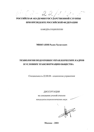 Мингазов Радик Халитович. Технологии подготовки управленческих кадров в условиях трансформации общества : диссертация ... кандидата социологических наук : 22.00.08.- Москва, 2001.- 157 с.: ил. РГБ ОД, 61 02-22/119-5