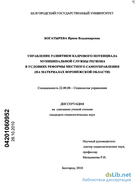 В методологическом плане использование принципов исследования систем дало возможность определить управление кадровым потенциалом муниципальной службы как динамическую систему, способную самодостраиваться в ответ на внутренние и внешние изменения. В диссертации использованы идеи концепции технологизации управления, основные положения которых изложены в научных трудах Н.С. Данакина, Л.Я. Дятченко, В.Н. Иванова, М. Маркова, Г.И. Осадчей, В.И. Патрушева, H.A. Чижова, В.И. Щербины, В.А. Ядова и др. авторов, а также методы системного и функционального анализа, сравнения, сбора и обобщения эмпирических данных. Обработка первичной социологической информации осуществлялась с помощью методов структурного, сравнительного, факторного анализа, группировки и классификации социальных переменных, методов математической статистики с использованием специального прикладного программного обеспечения.