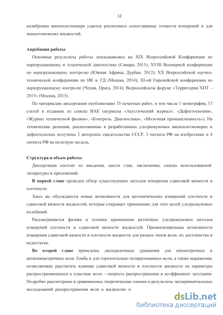 По материалам диссертации опубликовано 35 печатных работ, в том числе 1 монография, 13 статей в изданиях из списка ВАК (журналы «Акустический журнал», «Дефектоскопия», «Журнал технической физики», «Контроль. Диагностика», «Молочная промышленность»). На технические решения, реализованные в разработанных ультразвуковых вископлотномерах и дефектоскопах, получены 2 авторских свидетельства СССР, 3 патента РФ на изобретение и 4 патента РФ на полезную модель.