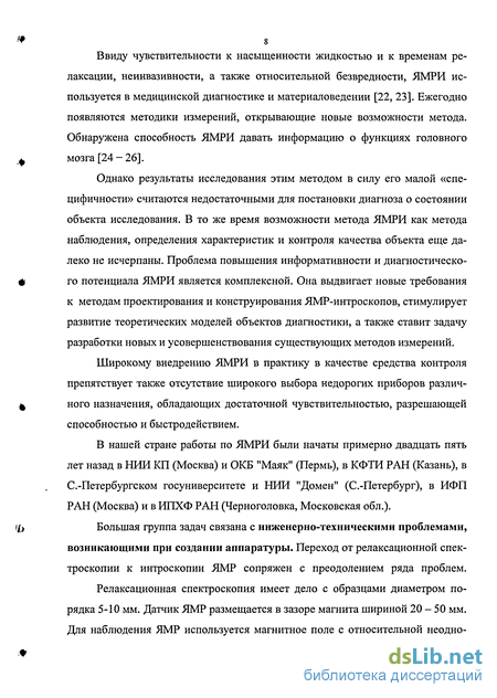 Однако результаты исследования этим методом в силу его малой «специфичности» считаются недостаточными для постановки диагноза о состоянии объекта исследования. В то же время возможности метода ЯМРИ как метода наблюдения, определения характеристик и контроля качества объекта еще далеко не исчерпаны. Проблема повышения информативности и диагностического потенциала ЯМРИ является комплексной. Она выдвигает новые требования к методам проектирования и конструирования ЯМР-интроскопов, стимулирует развитие теоретических моделей объектов диагностики, а также ставит задачу разработки новых и усовершенствования существующих методов измерений.