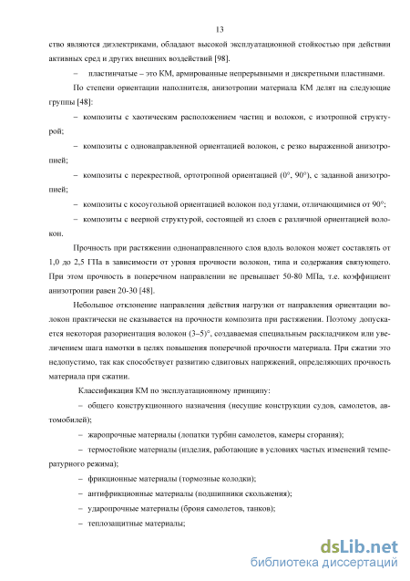 В соответствии с геометрией армирующих элементов композиты делятся на следующие виды: - дисперсно-упрочненные - это КМ, в матрицу которых включены армирующие эл-менты в виде специально вводимых частиц (примесных или дисперсных фаз). Дисперсно-у-рочненные полимерные композиты состоят из полимерной матрицы, в которой распределены частицы наполнителя размером от 0,01 до 0,1 мкм. - волокнистые - это КМ, армированные непрерывными и дискретными волокнами. Волокнистые КМ представляют собой слоистую структуру, в которой каждый слой армирован большим числом параллельных непрерывных волокон. Каждый слой можно армировать также непрерывными волокнами, сотканными в ткань, которая представляет собой исходную форму, по ширине и длине соответствующую конечному материалу. Прочность волокнистых матери-лов определяется свойствами волокон; матрица, в основном, должна перераспределять напр-жения между армирующими элементами, поэтому прочность и модуль упругости волокон до-жны быть значительно больше, чем прочность и модуль упругости матрицы. Отличительной особенностью волокнистых одноосных КМ являются анизотропия механических свойств вдоль и поперек волокон и малая чувствительность к концентраторам напряжения [9]. Волокнистые ПКМ имеют значительно меньшую плотность и более высокие удельные механические хара-теристики, менее теплоемки и теплопроводны, чем многие другие виды материалов. Больший 13 ство являются диэлектриками, обладают высокой эксплуатационной стойкостью при действии активных сред и других внешних воздействий [98]. - пластинчатые - это КМ, армированные непрерывными и дискретными пластинами. По степени ориентации наполнителя, анизотропии материала КМ делят на следующие группы [48]: - композиты с хаотическим расположением частиц и волокон, с изотропной структу рой; пиеи; пиеи; композиты с однонаправленной ориентацией волокон, с резко выраженной анизотро композиты с перекрестной, ортотропной ориентацией (0, 90), с заданной анизотро композиты с косоугольной ориентацией волокон под углами, отличающимися от 90; композиты с веерной структурой, состоящей из слоев с различной ориентацией воло кон.