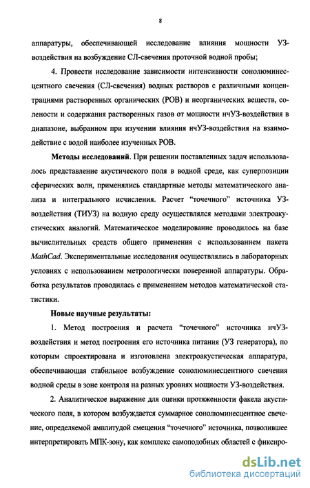 Методы исследований. При решении поставленных задач использовалось представление акустического поля в водной среде, как суперпозиции сферических волн, применялись стандартные методы математического анализа и интегрального исчисления. Расчет "точечного" источника УЗ-воздействия (ТИУЗ) на водную среду осуществлялся методами электроакустических аналогий. Математическое моделирование проводилось на базе вычислительных средств общего применения с использованием пакета MathCad. Экспериментальные исследования осуществлялись в лабораторных условиях с использованием метрологически поверенной аппаратуры. Обработка результатов проводилась с применением методов математической статистики.