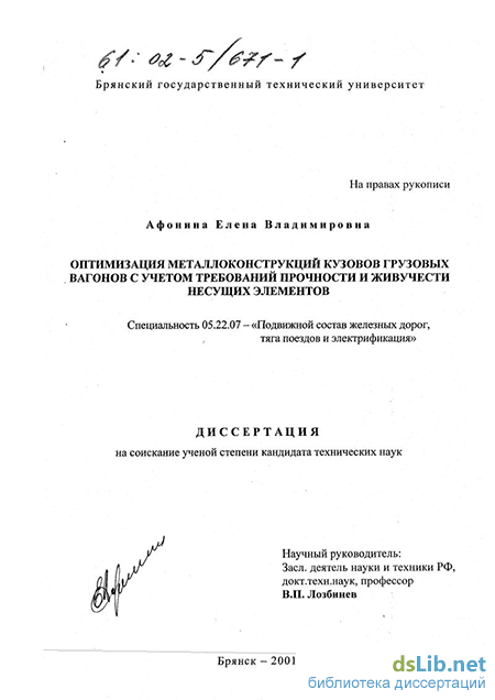 Афонина Елена Владимировна. Оптимизация металлоконструкций кузовов грузовых вагонов с учетом требований прочности и живучести несущих элементов : диссертация ... кандидата технических наук : 05.22.07.- Брянск, 2001.- 168 с.: ил. РГБ ОД, 61 02-5/671-1