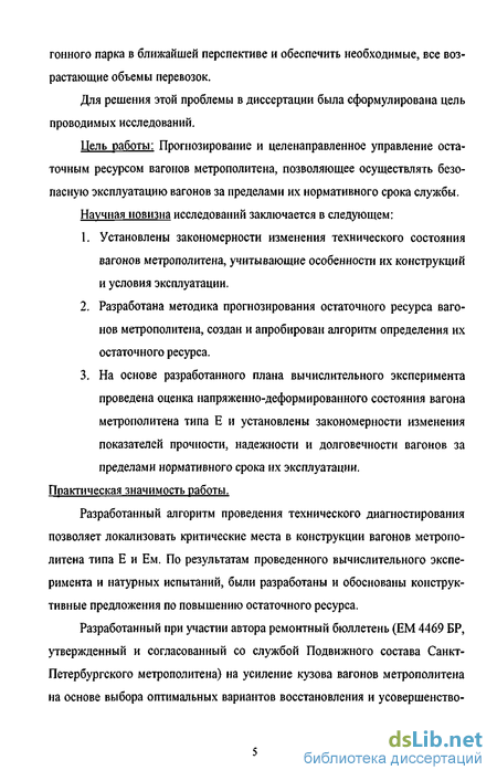 Цель работы; Прогнозирование и целенаправленное управление остаточным ресурсом вагонов метрополитена, позволяющее осуществлять безопасную эксплуатацию вагонов за пределами их нормативного срока службы.