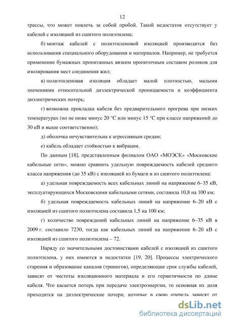 Сравнивая кабели с бумажной пропитанной изоляцией и из сшитого полиэтилена, можно выявить значительные преимущества последних. К основным их достоинствам можно отнести следующие: а) в кабелях с пропитанной изоляцией при наличии больших разностей уровней прокладки происходит осушение изоляции в более высоких точках трассы, что может повлечь за собой пробой. Такой недостаток отсутствует у кабелей с изоляцией из сшитого полиэтилена; б) монтаж кабелей с полиэтиленовой изоляцией производится без использования специального оборудования и материалов. Например, не требуется применение бумажных пропитанных вязким пропиточным составом роликов для изолирования мест соединения жил; в) полиэтиленовая изоляция обладает малой плотностью, малыми значениями относительной диэлектрической проницаемости и коэффициента диэлектрических потерь; г) возможна прокладка кабеля без предварительного прогрева при низких температурах (но не ниже минус 20 С или минус 15 С при классе напряжений до 30 кВ и выше соответственно); д) оболочка нечувствительна к агрессивным средам; е) кабель обладает стойкостью к вибрации. По данным [18], представленным филиалом ОАО «МОЭСК» «Московские кабельные сети», можно сравнить удельную повреждаемость кабелей среднего класса напряжения (до 35 кВ) с изоляцией из бумаги и из сшитого полиэтилена: а) удельная повреждаемость всех кабельных линий на напряжение 6-35 кВ, эксплуатирующихся Московскими кабельными сетями, составила 10,8 на 100 км; б) удельная повреждаемость кабельных линий на напряжение 6-20 кВ с изоляцией из сшитого полиэтилена составила 1,5 на 100 км; г) количество повреждений кабельных линий на напряжение 6-35 кВ в 2009 г. составило 7230, тогда как кабельных линий на напряжение 6-20 кВ с изоляцией из сшитого полиэтилена - 72.