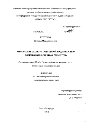 Предмет исследования - эксплуатационная надежность электровозов серии «O'ZBEKISTON», в условиях эксплуатации с грузовыми и пассажирскими поездами на железных дорогах Узбекистана.