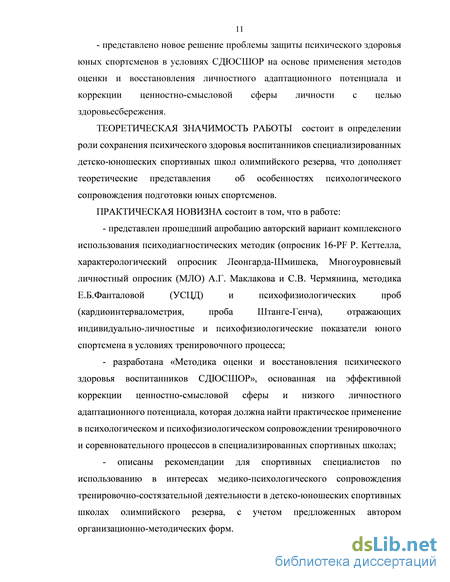 В диссертационном исследовании представлено новое, разработанное лично автором, решение проблемы защиты психического здоровья юных спортсменов, занимающихся профессиональным спортом в условиях специализированных детско-юношеских спортивных школ олимпийского резерва (СДЮСШОР) на основе применения методов оценки и восстановления личностного адаптационного потенциала, снижения рисков психическому здоровью и коррекции ценностно-смысловой сферы личности с целью здоровьесбережения.