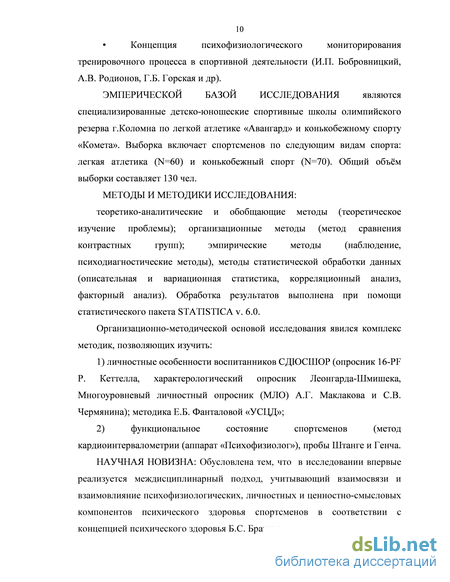 В интересах достижения поставленных целей и задач исследования нами были использованы следующие методы: - теоретико-аналитические и обобщающие методы (теоретическое изучение проблемы); - методики изучения личностных особенностей юных спортсменов; - методики оценки функционального состояния и психофизиологических резервов спортсменов; - метод экспертных оценок; - статистический анализ данных (описательная и вариационная статистика, корреляционный анализ, факторный анализ). Обработка результатов выполнена при помощи статистического пакета STATISTICA v. 6.0 и приложения MS Excel.
