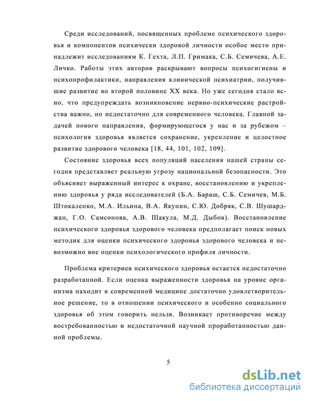 Состояние научной разработанности проблемы исследования. Проблеме психического здоровья посвящены многочисленные исследования в России и за рубежом (Г. Олпорт, А. Маслоу, К. Роджерс, Б.С. Братусь, И.В. Дубровина, В.И. Слободчиков, В.А. Ананьев, Г.С. Никифоров и др). При этом многие теоретические работы и исследовательские программы используют понятия «психическое здоровье», «психологическое здоровье», «здоровая личность», «эмоциональное благополучие» как синонимы, ряд авторов (И.В. Дубровина, В.Э. Пахальян) отличают понятия «психическое здоровье» и «психологическое здоровье»; большинство авторов анализируют данные феномены преимущественно, с позиций традиционных клинических классификаций психического здоровья, основанных на патологии.